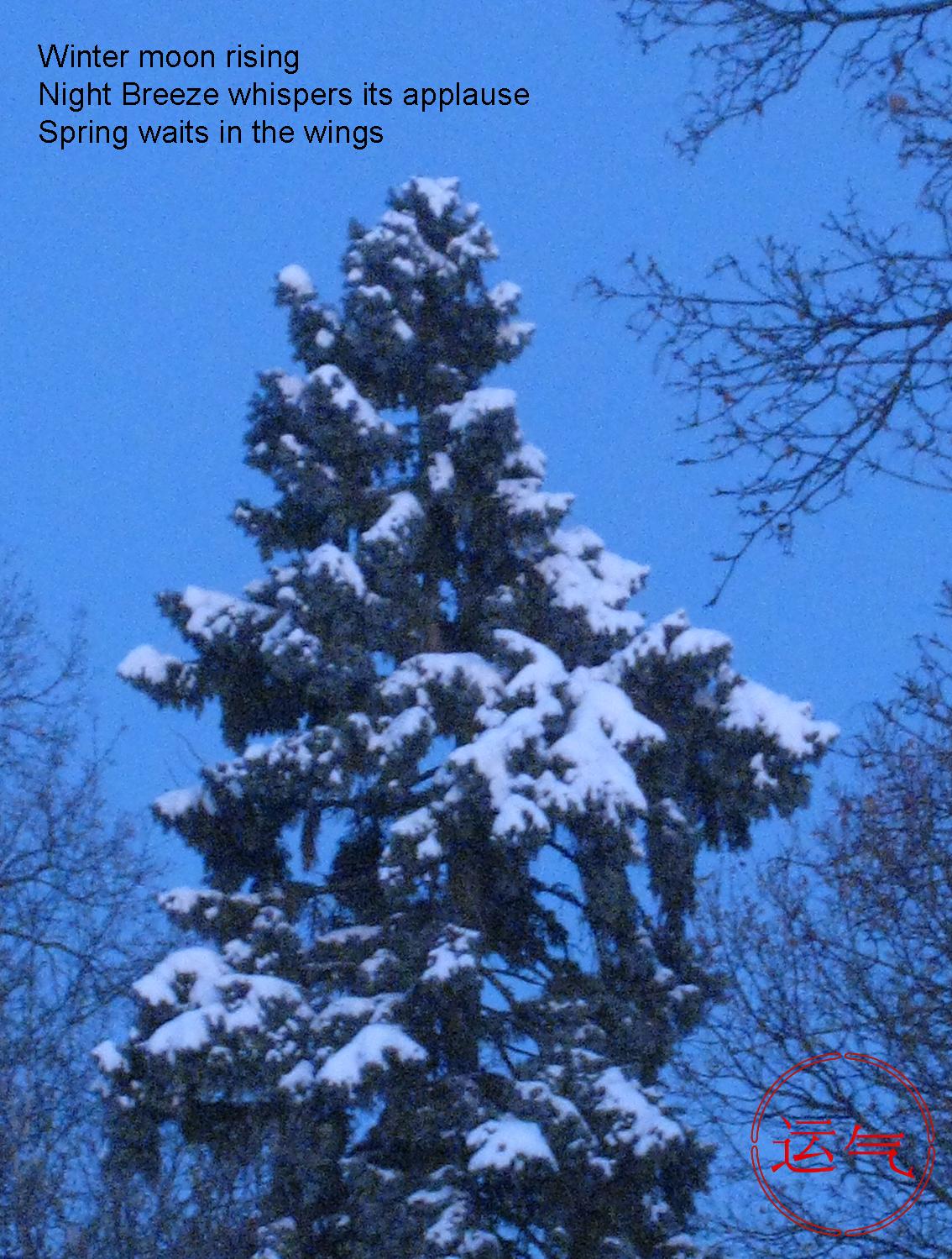 Winter moon rising Night Breeze whispers its applause Spring waits in the wings